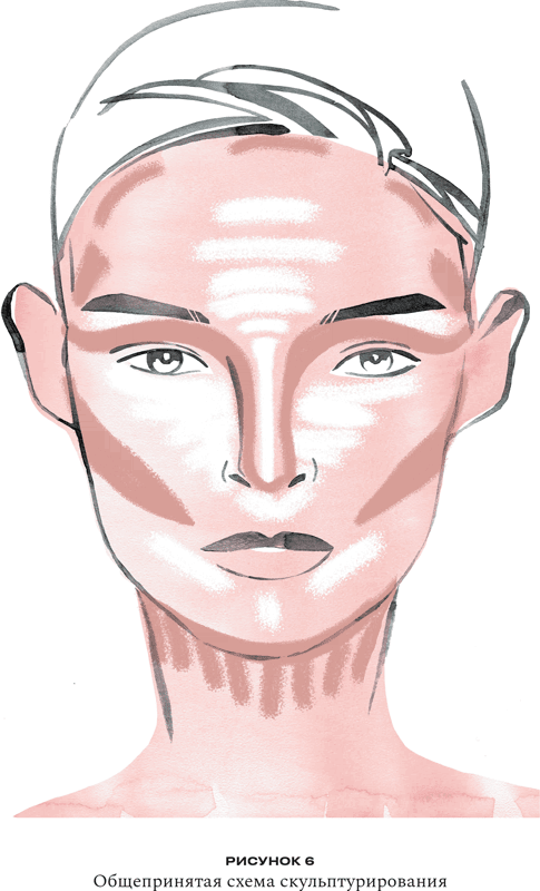 Простой ответ: ориентируйтесь на общепринятую схему скульптурирования. Вы наверняка с ней знакомы: затемняют низ скул, нижнюю челюсть, боковые стороны носа, виски, а высветляют верх скул, спинку носа, внутренний уголок и центр глаза, иногда подбородок. Это дает неплохой результат, но может быть не лучшим для вас вариантом – просто потому, что все лица разные.