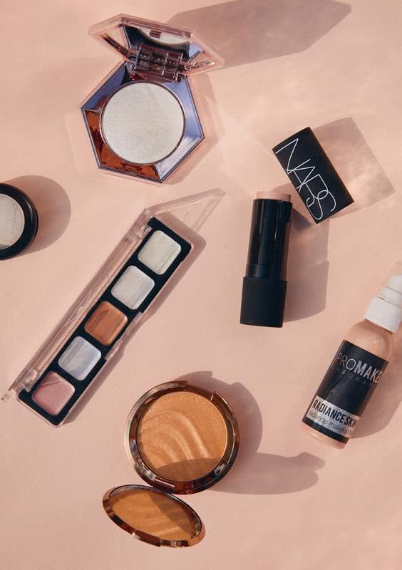 В естественном макияже хайлайтером может быть все, что натурально блестит (бальзам для губ, база под макияж, атласные тени) или слегка высветляет (тон на оттенок светлее). Когда естественность не важна, подойдут любые блестящие штуки: тени, радужные хайлайтеры, сияющие пудры.
