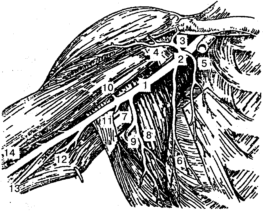 1— подмышечная артерия; 2 — грудо-акромиальная артерия; 3 — акромиальная ветвь; 4—дельтовидная ветвь; 5— грудные ветви; 6 — латеральная грудная артерия; 7— подлопаточная артерия; 8 — грудоспинная артерия; 9 — артерия, огибающая лопатку; 10 - передняя артерия, огибающая плечевую кость; 11 — задняя артерия, бающая плечевую кость; 12— глубокая артерия плеча; 13— верхняя тевая коллатеральная артерия; 14 — плечевая артерия