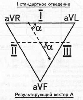 Мысленно поместим результирующий вектор возбуждения желудочков внутрь треугольника Эйнтховена. Угол, образованный направлением результирующего вектора и осью I стандартного отведения, и есть искомый угол альфа.