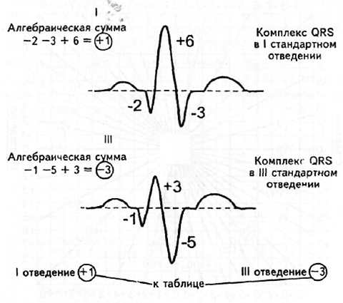 Найти алгебраическую сумму зубцов желудочкового комплекса достаточно просто: измеряют в миллиметрах величину каждого зубца одного желудочкового комплекса QRS, учитывая при этом, что зубцы Q и S имеют знак минус (—), поскольку находятся ниже изоэлектрической линии, а зубец R — знак плюс (+). Если какой-либо зубец на электрокардиограмме отсутствует, то его значение приравнивается к нулю (0).