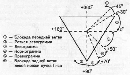 И наконец, если значение угла альфа будет меньше минус 30° (например, минус 45°) — говорят о блокаде передней ветви левой ножки пучка Гиса.