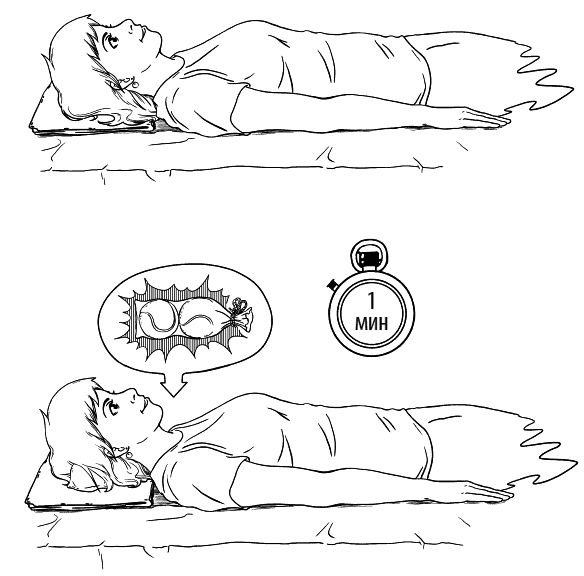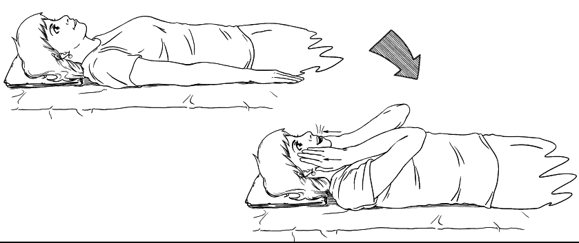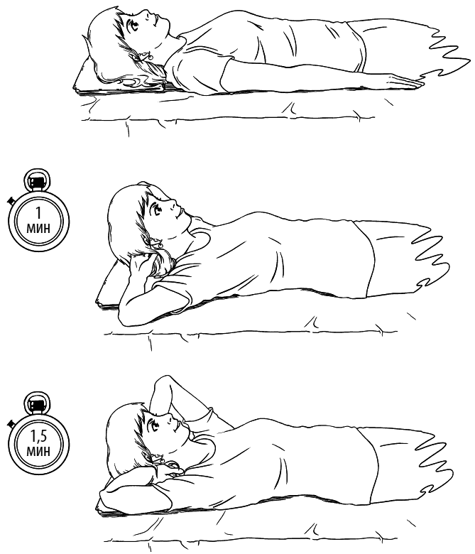 Лягте на спину. Согните кончики пальцев рук, обопритесь на них затылком. Важно, чтобы вес головы распределялся равномерно на кончики пальцев. Вы лежите, при этом ваш затылок опирается на кончики пальцев.