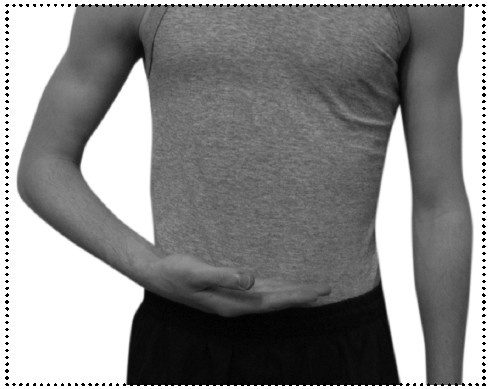 7. Выдохнуть, произнося ХЭ. Одновременно развернуть ладони друг к другу и сблизить их, опуская в область пупка.