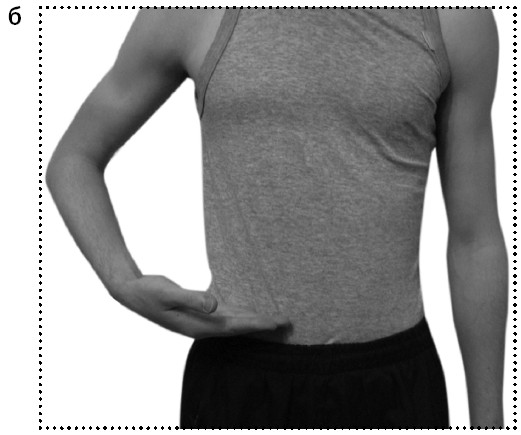 1. Ведущая рука сгибается в локте, ладонь параллельно полу (фото 7, а).