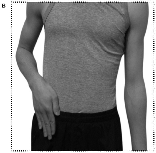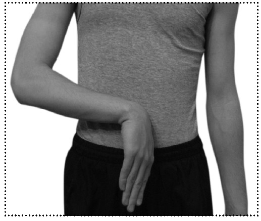 5. Примите исходное положение: Стоя, ноги на ширине плеч. Тело расслаблено. Руки согнуты в локтях в области груди, кисти рук свисают вниз вертикально. Ладони соприкасаются друг с другом.