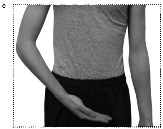 4. Ладонь поворачивается параллельно полу и направляется к подвздошной области (фото 7, д). Оттуда опускается вниз к лобковой части (фото 7, е). При движении вниз произносим звук ЮЙ.