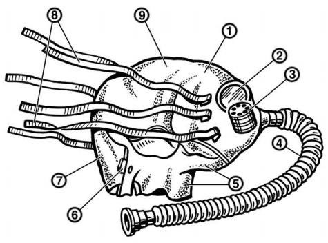 Рис.12 Шлем для раненных в голову (ШР) 1 – плотная часть шлем-маски; 2 – очки; 3 – клапанная коробка с выдыхательным клапаном; 4 – соединительная (гофрированная) трубка; 5 – мягкий пояс обтуратора; 6 – обтуратор; 7 – клиновидный клапан из тонкой резины; 8 – тесемки; 9 – теменная часть шлема.