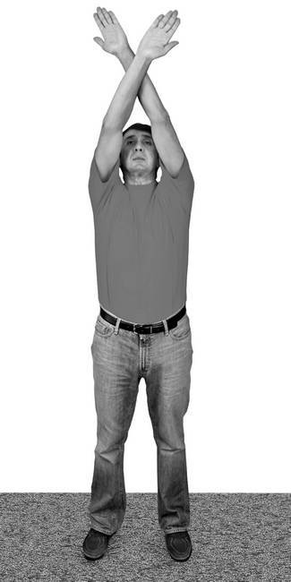 На счет «раз» шумно и коротко вдохните, одновременно поднимите прямые руки вверх и скрестите их на уровне лица. На счет «два» верните их в исходное положение, пассивно и неслышно выдыхая.