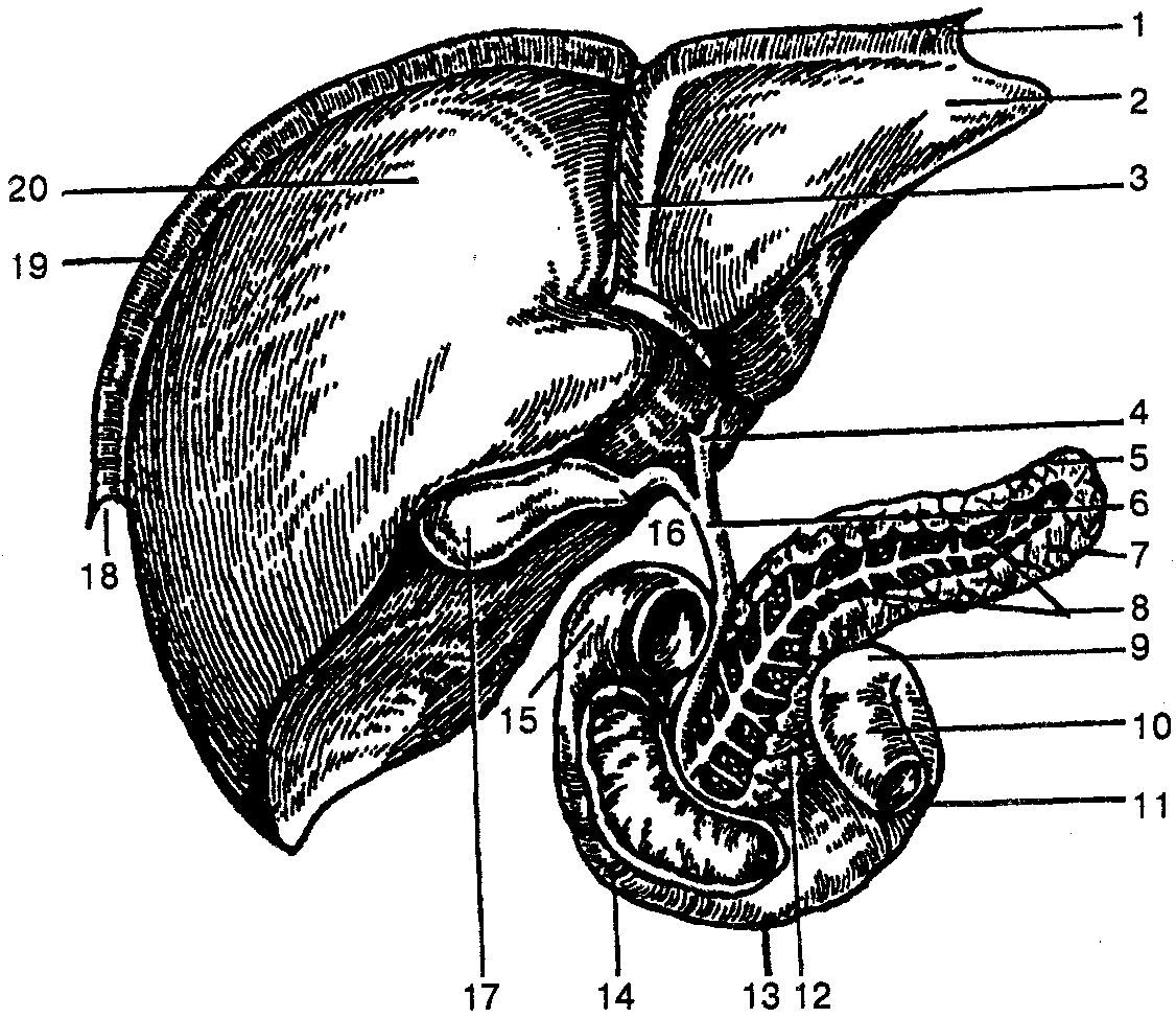 1 — левая треугольная связка; 2 — левая доля печени; 3 — серповидная связка (печени); 4— общий печеночный проток; 5— поджелудочная железа; 6— общий желчный проток; 7— хвост поджелудочной железы; 8— проток поджелудочной железы; 9 — двенадцатиперстно-тощий изгиб; 10 — тощая кишка; 11 — восходящая часть двенадцатиперстной кишки; 12 — головка поджелудочной железы; 13 — горизонтальная часть двенадцатиперстной кишки; 14 — нисходящая часть двенадцатиперстной кишки; 15 — верхняя часть двенадцатиперстной кишки; 16 ~ пузырный проток; 17— желчный пузырь; 18 ~ правая треугольная связка; 19— венечная связка; 20 — правая доля печени