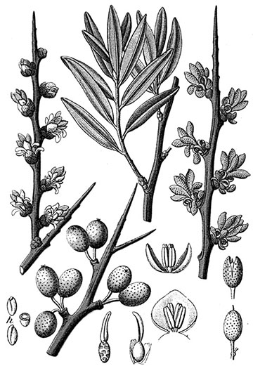Облепиха — ippophae rhamnoides L. (семейство Elaegnaceae) — часто встречается по долинам рек на песчаных отмелях на юге европейской части России, на Кавказе, в Сибири и в Средней Азии; это ветвистый колючий кустарник с характерными оранжевыми плодами, густо облепляющими ветви. Они очень ароматны и широко используются в Сибири на кисели, варенье и наливки; собирают их обычно только после заморозков.