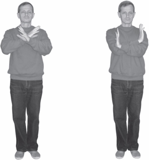Ладони (левая впереди) скрещены перед грудью в форме латинской буквы «Икс» («Х»). Правая ладонь обращена влево, левая – вправо.