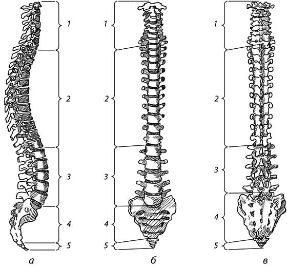 а – вид справа; б – вид спереди; в – вид сзади; 1 – шейный отдел (С), 7 позвонков; 2 – грудной отдел (Th), 12 позвонков; 3 – поясничный отдел (L), 5 позвонков; 4 – крестцовый отдел (S), 5 сросшихся позвонков; 5 – копчиковый отдел (Со), 4–5 сросшихся позвонков