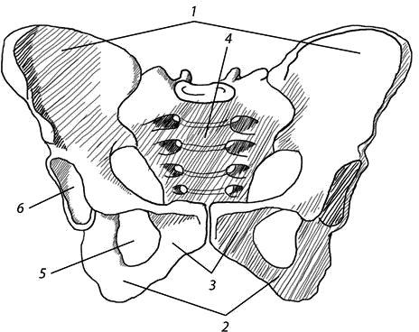 1 – крылья подвздошной кости; 2 – седалищные кости; 3 – лобковые кости; 4 – крестцовая кость; 5 – запирательное отверстие; 6 – вертлужная впадина (суставная поверхность тазобедренного сустава)