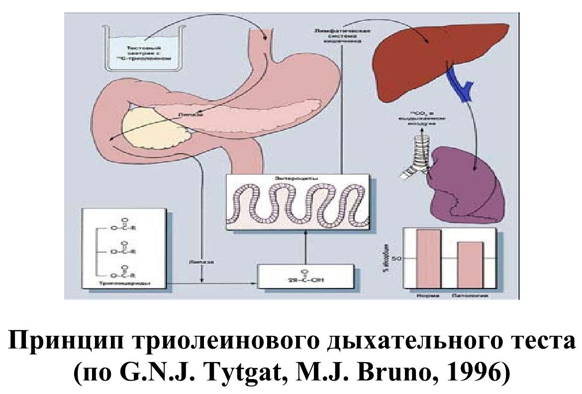 • Дыхательные тесты с меченными радиоактивными изотопами триглицеридами (триолеином, триоктаноином, трипалмитином), обычно с С-триоленом. Они обладают высокой чувствительностью при умеренном снижении функции поджелудочной железы и позволяют установить достаточные различия между заболеваниями тонкой кишки и поджелудочной железы.