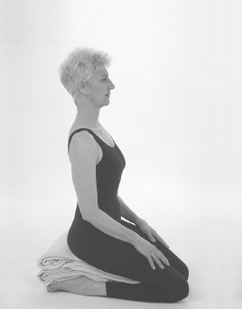 Адаптированный вариант Вирасаны. Сядьте на большую подушку, подогнув колени, бедра сжаты, стопы и пальцы ног направлены назад. Голени должны выходить за пределы бедер, но при этом касаться краев подушки. Руками потяните икры вбок, чтобы сесть ниже и более комфортно. Слегка изогните спину. Постарайтесь, чтобы уши, плечи, бедра и пятки находились в одной плоскости. Грудная клетка «раскрыта». Положите ладони или тыльные части рук на бедра. Держа голову прямо, подтяните подбородок. Втяните живот. Расслабьте ноги, грудь и мышцы спины. Дышите спокойно с закрытым ртом. Оставайтесь в позе 10–15 секунд.