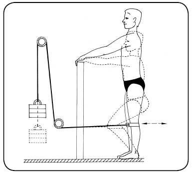Берем тросик от груза, пропускаем через два блока и закрепляем на коленях ременной петлей. Выполняем коленями движения вперед-назад.