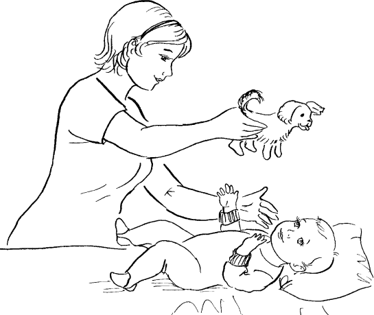 Малыш может находить игрушку взглядом, смотреть на нее, поворачивать в ее сторону голову. Когда он ее находит, радуйтесь вместе с ним: «Вот она киска! Вот она собачка!»