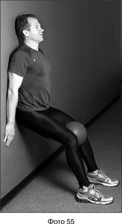 3. Не расслабляя мышцы пресса, медленно опускайтесь вниз по стене, пока колени не согнутся под углом примерно 60 градусов (см. фото 55), почти параллельно полу. Это ограничение уменьшает давление на колени, при этом квадрицепсы не перестают работать.