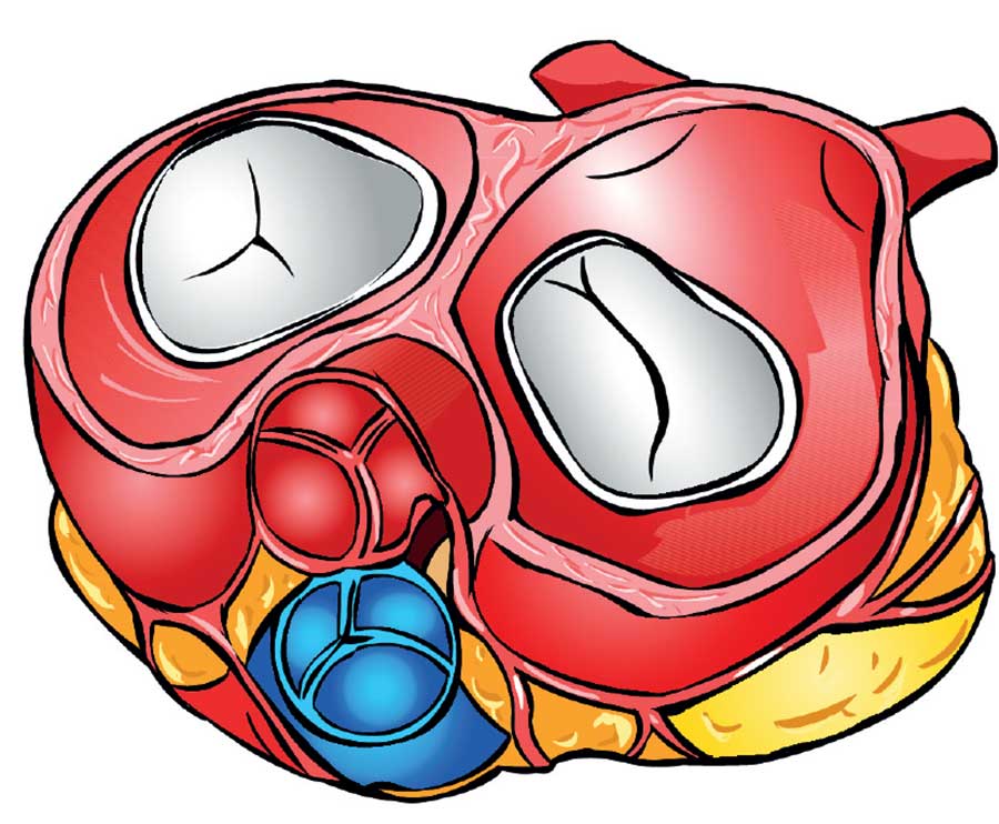 Выходные отверстия из полостей сердца разделены между собой клапанами, которые обеспечивают во время систолы движение крови только в одном направлении, препятствуя ее возвращению. Слева расположены митральный (между предсердием и левым желудочком) и аортальный (между желудочком и аортой) клапаны, справа – трикуспидальный клапан (между предсердием и желудочком), на выходе из правого желудочка – клапан легочной артерии.