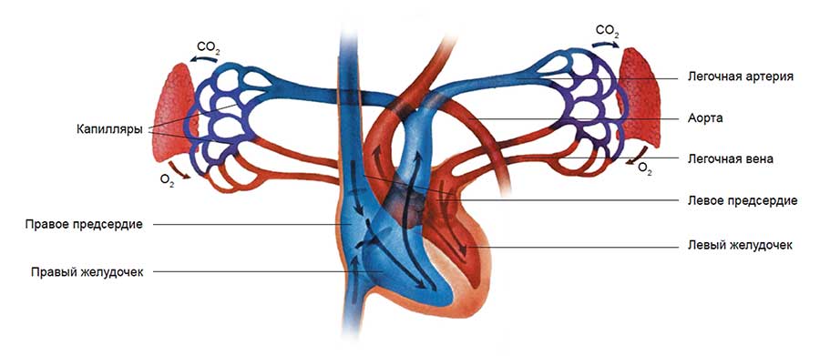 В целом удобнее рассматривать систему кровообращения, начиная с возврата крови к правым отделам сердца. В правое предсердие кровь поступает по двум крупным венам: верхняя полая вена возвращает кровь от верхней половины туловища, нижняя – несет кровь от нижней половины тела. Из предсердия кровь поступает в правый желудочек, при сокращении которого через легочную артерию кровь нагнетается в легкие. Разветвление легочных артерий образует капиллярную сеть, которая связана с альвеолами. Именно на этом уровне происходит обмен газами между альвеолами и кровью, так называемый этап тканевого дыхания. Затем кровь, обогащенная кислородом, возвращается к сердцу и по четырем венам (две от каждого легкого) впадает в левое предсердие. В дальнейшем во время систолы левый желудочек под высоким давлением выталкивает кровь в аорту, от которой ответвляются все артерии, образующие большой круг кровообращения, снабжающие кровью все органы и ткани организма.