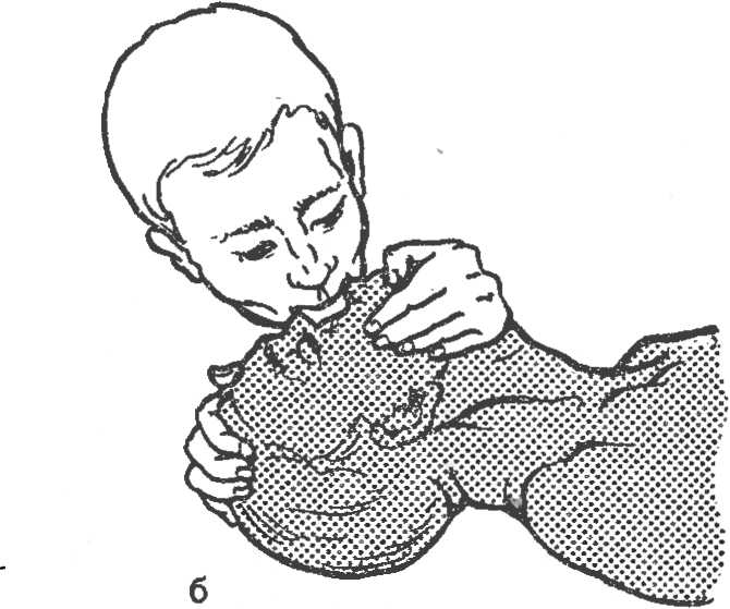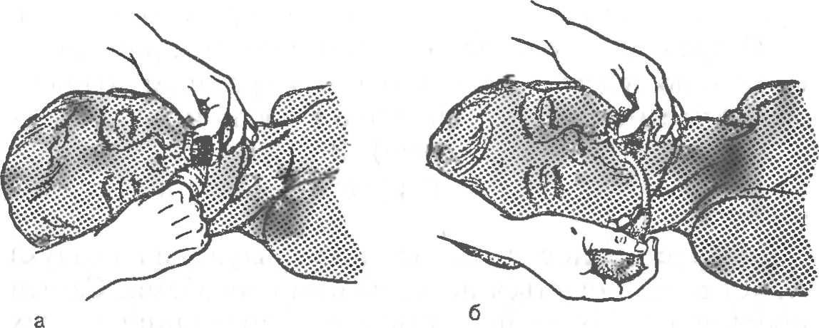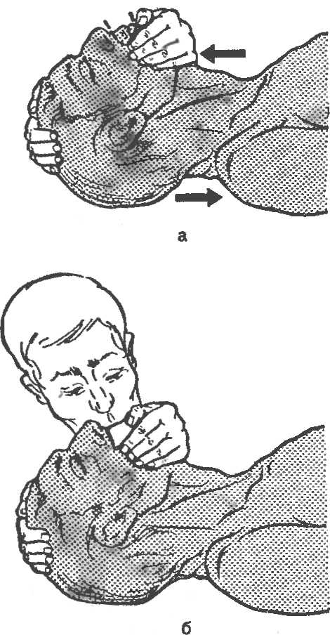 Рис. 23. Искусственная вентиляция легких методом рот в нос. а — положение головы пострадавшего; б — вдувание воздуха через нос.