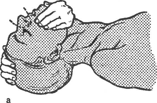 При проведении дыхания способом рот в рот голову пострадавшего удерживают в определенном положении (рис. 21). Реаниматор, сделав глубокий вдох и плотно прижав свой рот ко рту больного, вдувает в его легкие воздух. При этом рукой, находящейся у лба пострадавшего, необходимо зажать нос. Выдох осуществляется пассивно, за счет эластических сил грудной клетки. Число дыханий в минуту должно быть не менее 16—20. Вдувание надо проводить быстро и резко (у детей менее резко), чтобы продолжительность вдоха была в 2 раза меньше времени выдоха.