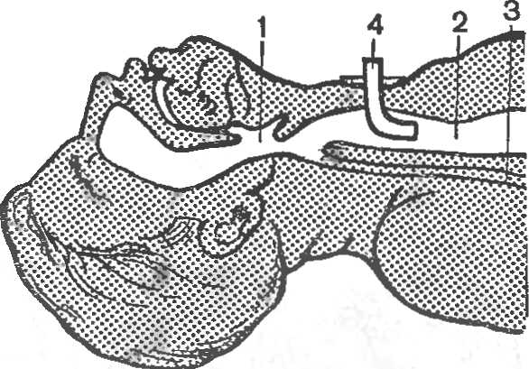 1 — гортань; 2 — трахея; З — пищевод; 4 — трахеотомическая трубка.