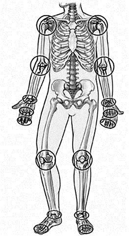 Постепенно в патологический процесс вовлекаются все новые, ранее здоровые суставы (рис. 2.4). Чаще других воспаляются колени, локти, голеностопные и плечевые суставы. Воспаление локтевых, плечевых и голеностопных суставов обычно протекает относительно мягко, но приводит к заметной тугоподвижности сустава, иногда к довольно резкому ограничению движений в суставе.