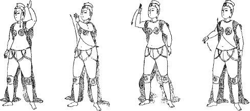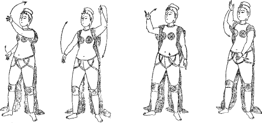 Закончив выполнение предыдущего приема, левую руку (женщины – правую руку) снизу по дуге поднимите вверх (ладонь смотрит вправо, пальцы – вперед), а затем мимо уха опустите вниз. Одновременно с этим движением правой рукой (женщины – левой рукой) опишите дугу снизу вперед вверх, а затем мимо уха опустите ее вниз. Выполните эти движения трижды, согласуя их с волнообразными движениями позвоночника вперед—назад и меняя руки. В конце опустите руки вниз и поместите их над ногами.