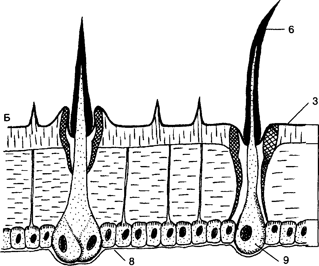 А – общий вид брюшка сбоку; Б – разрез кожи (схема); 1 – жёсткий склерит; 2 – эластичная мембрана; 3 – наружный слой кутикулы; 4 – средний слой кутикулы; 5 – внутренний слой кутикулы; 6 – чувствительные волоски; 7 – гиподерма; 8 – базальная мебрана; 9 – клетка , образующая волосок