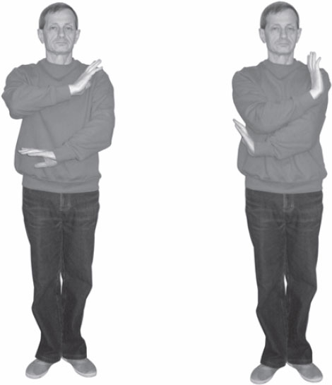 На выдохе грудь «закрывается» и правая ладонь движется влево, а левая – вправо. Пальцы при этом поднимаются кверху.