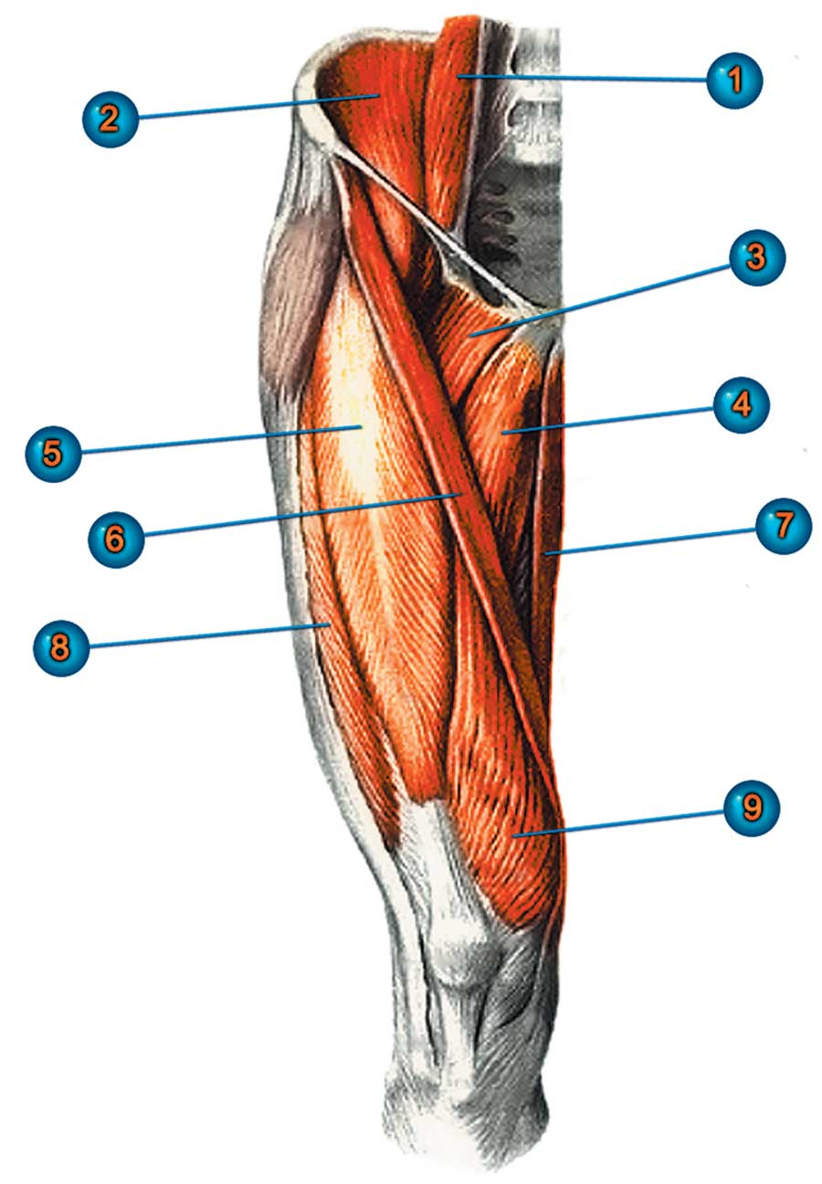 Мышцы передней поверхности бедра: 1 – большая поясничная мышца, 2 – подвздошная мышца, 3 – гребенчатая мышца, 4 – длинная приводящая мышца, 5 – прямая мышца бедра, 6 – портняжная мышца, 7 – тонкая мышца, 8 – латеральная широкая мышца бедра, 9 – медиальная широкая мышца бедра