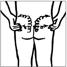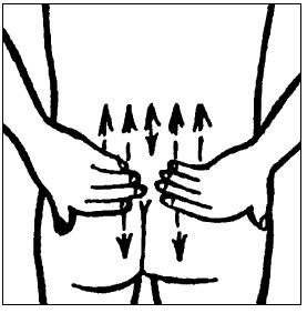 Подушечками пальцев выполнить кругообразное растирание. Пальцами обеих рук делать мелкие вращательные движения, плавно надавливая и как бы прощупывая копчик, крестец, поясницу. Руки двигаются от копчика вверх до поясницы, а затем в стороны (рис. 4).