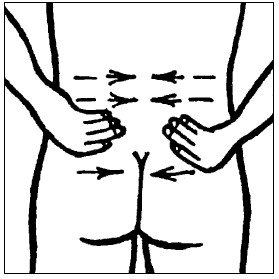 Исходное положение — стоя. Поглаживание: руки двигать вдоль позвоночника от середины ягодиц к пояснице, затем — вправо и влево по верхним краям тазовых костей (рис. 3).