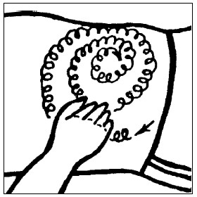 Слегка согнув кисть правой руки, погрузить кончики пальцев в брюшную стенку. Производить вращательные растирающие движения сужающимися кругами к пупку от правой паховой складки (рис. 11), затем — в обратном направлении расширяющимися кругами. Закончить массаж поглаживанием.