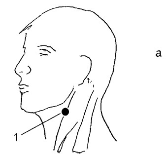 1. Подушечкой большого пальца надавливайте на точку 1 под нижней челюстью в месте прохождения сонной артерии. Вы найдете ее по пульсации на шее (рис. 46, а).