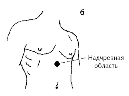 4. Четырьмя пальцами с обеих сторон туловища надавливайте надчревную область (рис. 46, б) в течение 10 секунд. И повторите это надавливание 10 раз.
