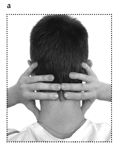 2. После этого средними пальцами рук, касающимися друг друга в подушечке, надавливайте на область продолговатого мозга, до 8-10 секунд. Пальцами обеих рук одновременно надавливайте на основание затылочной кости, и натри точки выше основания (фото 13, а). Данный прием повторите 3 раза, всякий раз усиливая давление.