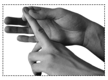 5. Большим и указательным пальцем одной руки зажмите подушечку среднего пальца другой руки. Сильно сдавите подушечку, сочетая надавливание с растяжением суставов среднего пальца (фото 13, в).