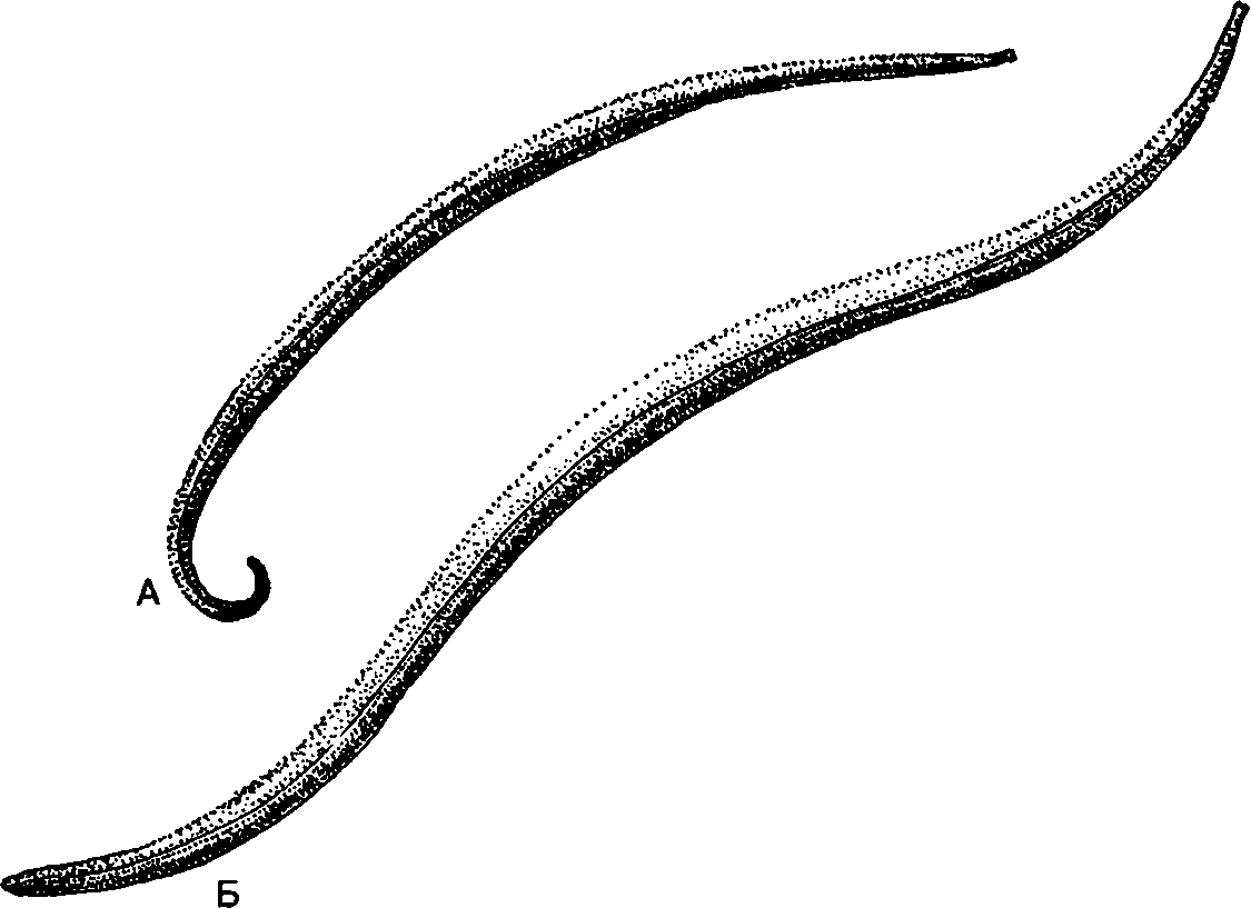 Трихинелла: А – взрослые черви; Б – личинки, инкапсулировавшиеся в мышцах