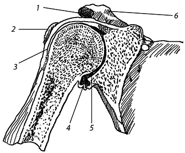 1 – подакромиальная сумка; 2 – большой бугорок плечевой кости; 3 – сухожилие длинной головки бицепса в межбугорковой борозде; 4 – капсула плечевого сустава; 5 – суставная (гленоидальная) впадина лопатки; 6 – акромиальный отросток лопатки