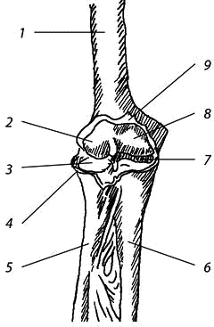 1 – плечевая кость; 2 – головчатое возвышение; 3 – головка лучевой кости; 4 – кольцевидная связка; 5 – лучевая кость; 6 – локтевая кость; 7 – полость сустава; 8 – блок плечевой кости; 9 – капсула сустава