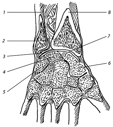 1 – локтевая кость; 2 – дистальный лучелоктевой сустав; 3 – хрящевой диск; 4 – полулунная кость; 5 – трехгранная кость; 6 – ладьевидная кость; 7 – полость лучезапястного сустава; 8 – лучевая кость