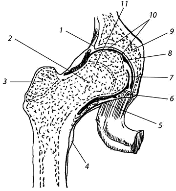 1 – ацетабулярная губа; 2 – шейка бедренной кости; 3 – большой вертел; 4 – малый вертел; 5 – капсула сустава; 6 – поперечная связка; 7 – связка головки бедра; 8 – полость сустава; 9 – тазовые кости; 10 – суставной хрящ; 11 – головка бедренной кости
