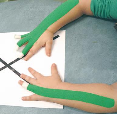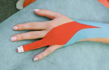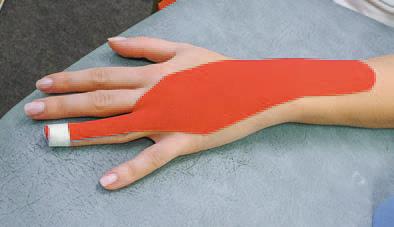 Комментарий к рисунку. На рис. 64, б показан подход, о котором в практике тейпирования вряд ли кто-то имеет представление (тейпирование здоровой стороны, параллельных здоровых мышц, активация рецепторного аппарата здоровой стороны, приводящая к включению двигательной активности пораженного участка и др.). Он связан с опытом применения других наших методик (22–24), теорией зеркальной терапии и базируется на глубоких физиологических законах. Здесь мы не будем подробно разбирать такие взаимосвязи, поскольку, как мы уже упоминали, комплексное применение тейпирования в сочетании с методами реабилитации требует отдельного обучения и серьезных публикаций. Цель данного варианта тейпирования – включение программы движения, дополнительная активация центров, отвечающих за рецепторную и двигательную функцию, включение программы симметричного (параллельного) движения и др. Наш опыт подтверждает высокую эффективность данного подхода. На рис. 64, в, г показана последовательность наложения тейпов для наглядности; вариант был реализован одномоментно, зеленый тейп закрыт сверху наложенным оранжевым.