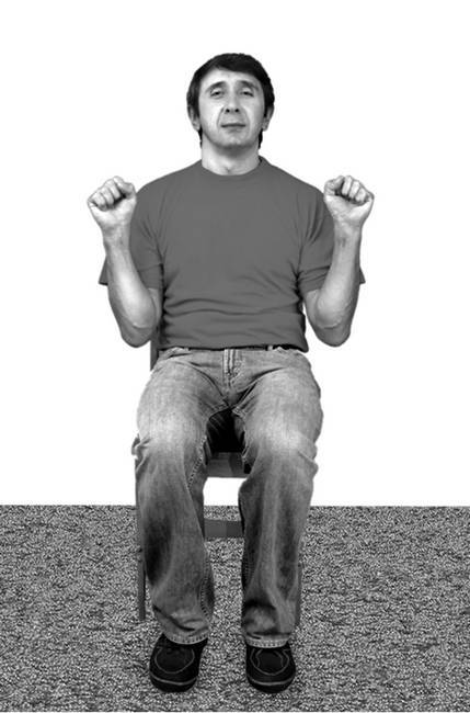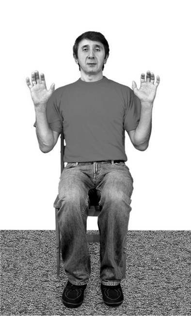 Исходное положение: сядьте на жесткий стул или табурет; ноги чуть уже ширины плеч. Корпус прямой, спина не напряжена, сидите свободно и легко, но не сутультесь. Согните руки в локтях (они должны быть направлены вниз) и покажите ладони зрителю – поза «экстрасенса».