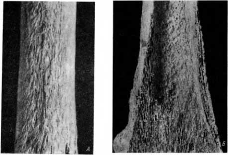 Поверхность диафиза бедренных и большеберцовых костей из-за своеобразно окостеневших периостальных наслоений была негладкой. Рисунок окостеневших периостальных наслоений отличался довольно правильной, но преимущественно продольной складчатостью (рис. 41, А). Эта складчатость напоминала кору старого дерева. Изменение рельефа особенно резко выражено в нижней трети большеберцовых костей, а также в нижней трети бедренных костей, почти на всем протяжении малоберцовых костей и на некоторых участках I пястной кости. Справа и слева в симметричных местах эти изменения были в общем одинаково выражены.