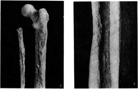Рис. 42. А — окостеневшие сифилитические периостальные наслоения на бедренной и малоберцовой костях; Б — неравномерное утолщение компактного вещества бедренной кости и неравномерное сужение костномозгового пространства при сифилитическом остеопериостите. Ср. с рис. 41, А.