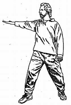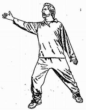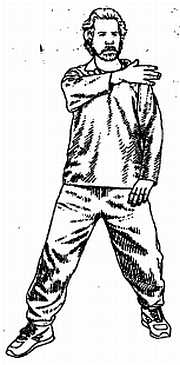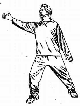 В этот момент вес вашего тела слегка сдвинут вправо, чуть больше на правую ногу, чем на левую. Таким образом, во всех этих маневрах достаточно много переносов веса с одной ноги на другую. Не беспокойтесь. С практикой все это придет естественно, без больших сознательных усилий. Между прочим, вы действительно можете выпрямить руку на этой стадии — пусть даже временно, потому что здесь вы должны ощутить тянущее чувство в локте. Убедитесь» что пальцы также не согнуты. Вытяните их и сохраните эту растяжку.